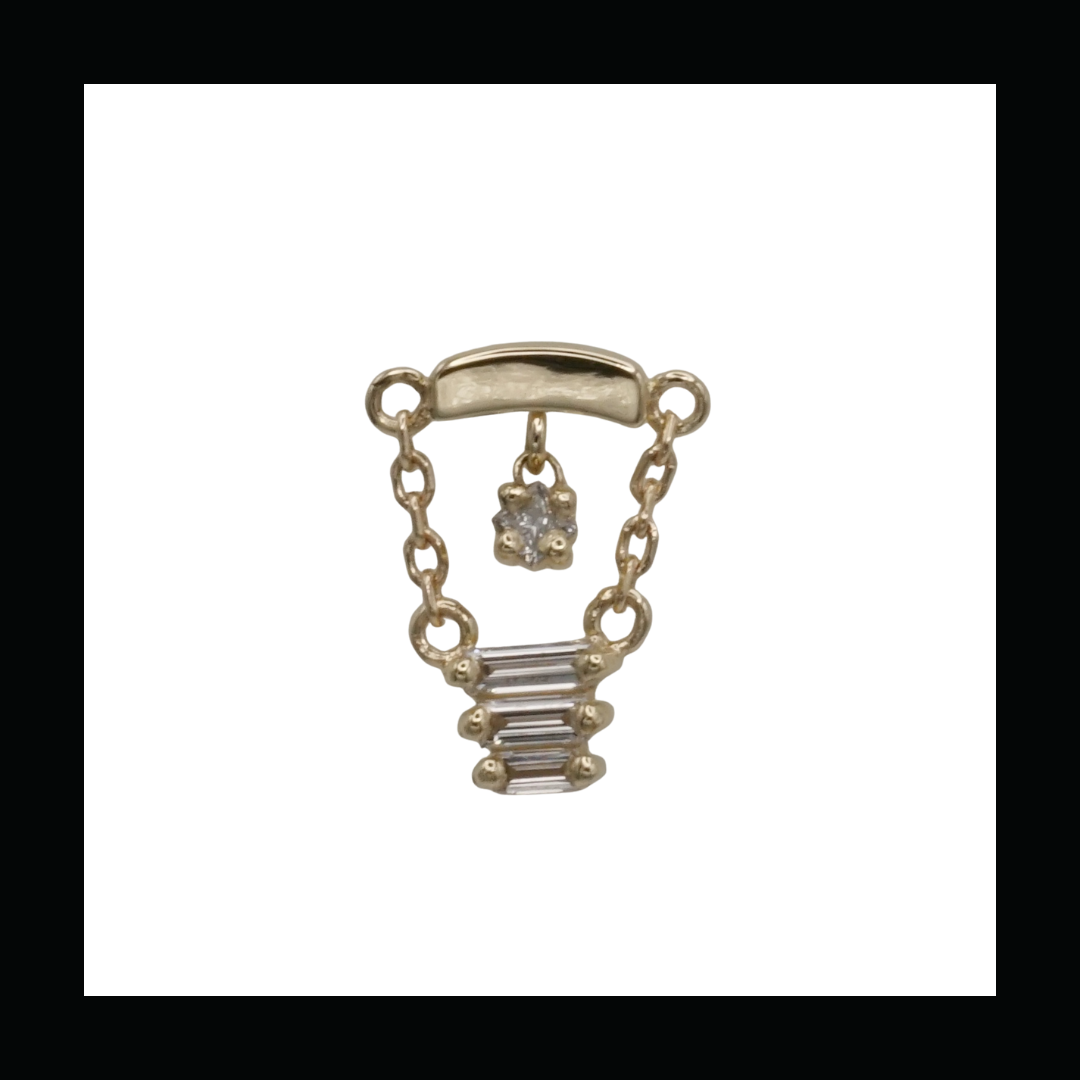 Threadless end designed for hidden helix piercings, holding 1 - 2mm x 1mm, 1 - 2.5mm x 1mm, and 1 - 3mm x 1mm baguette diamonds, and 1 - 1.5mm princess cut diamond.