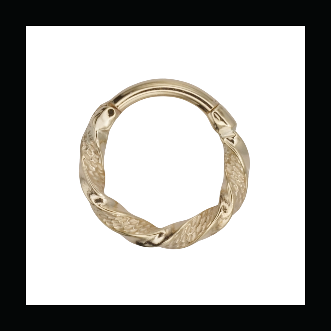 Hinged ring with a twisted design, alternating between high polish and hammered finishes.