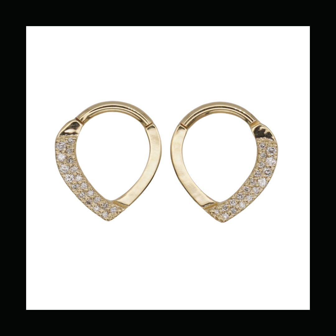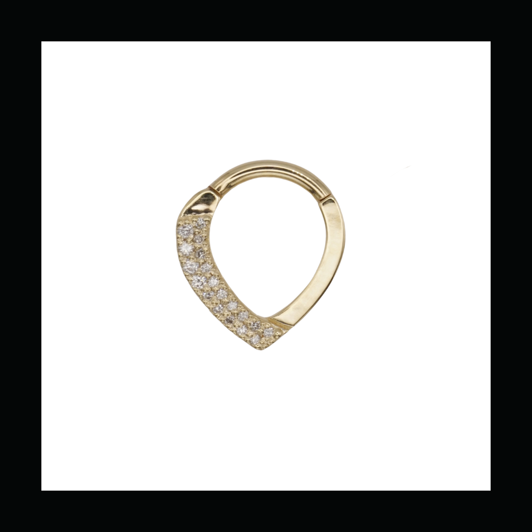 Hinged ring with an asymmetrical triangular shape, holding 15 - 0.8mm Diamonds and 4 - 1mm Diamonds.