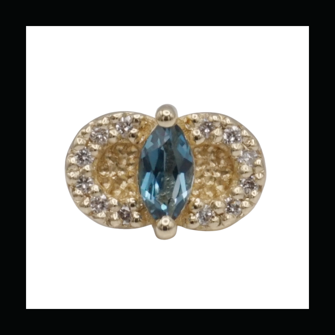 A marquise stone sitting on top of two hammered disks with diamond halos.