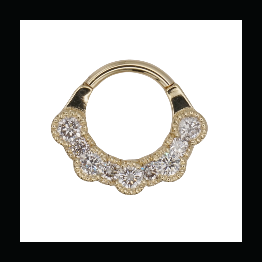 Hinged ring holding 4 - 2mm Diamonds and 5 - 2.5mm Diamonds, overlapped in beaded bezels.